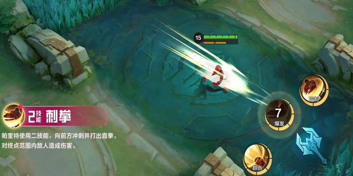 3、二技能為刺拳,向前沖刺并進(jìn)行拳擊對沿途敵人造成傷害并減速,可用于追擊敵人或在團(tuán)戰(zhàn)中穿插陣型打亂對方布局,具備機(jī)動性和控制效果。