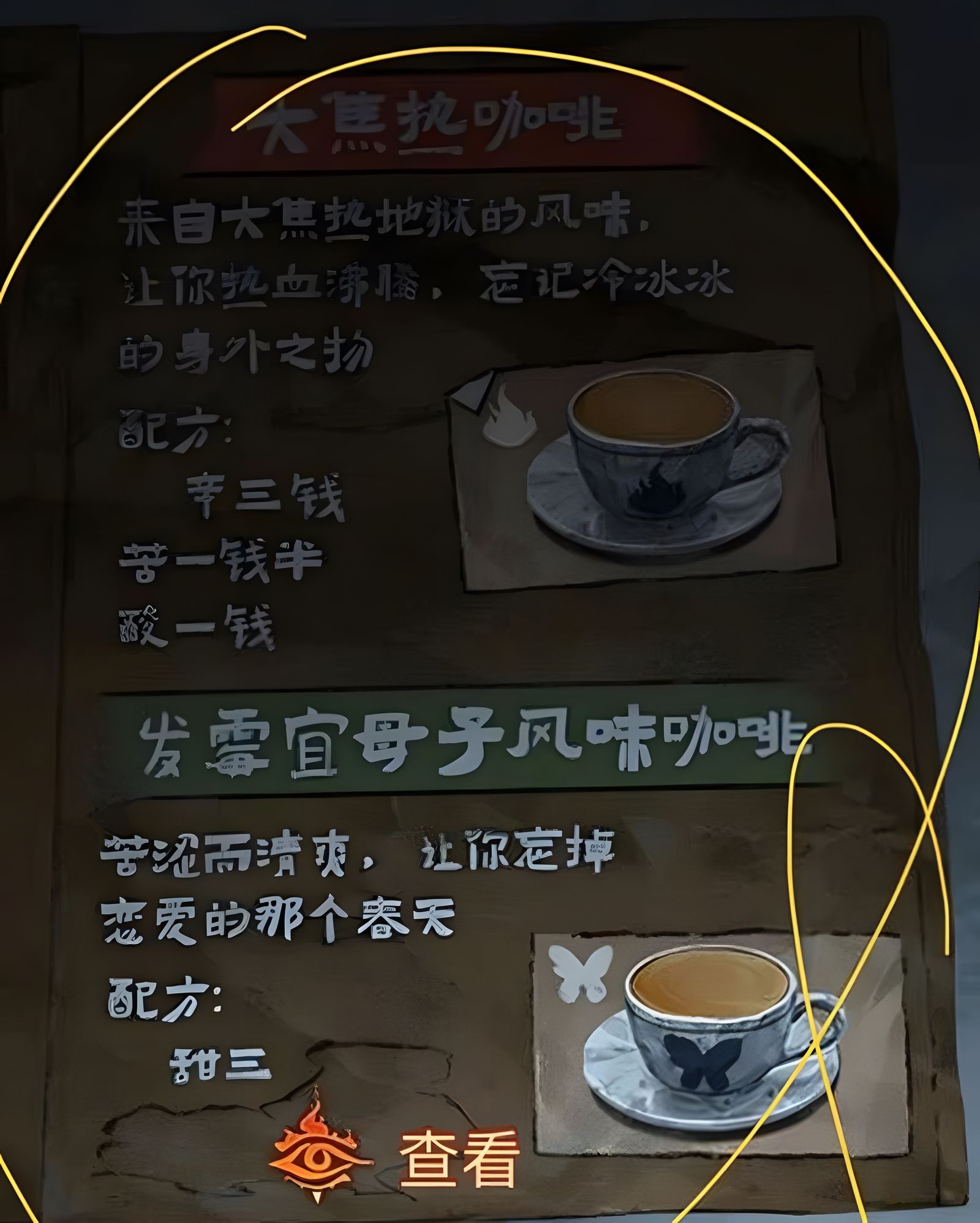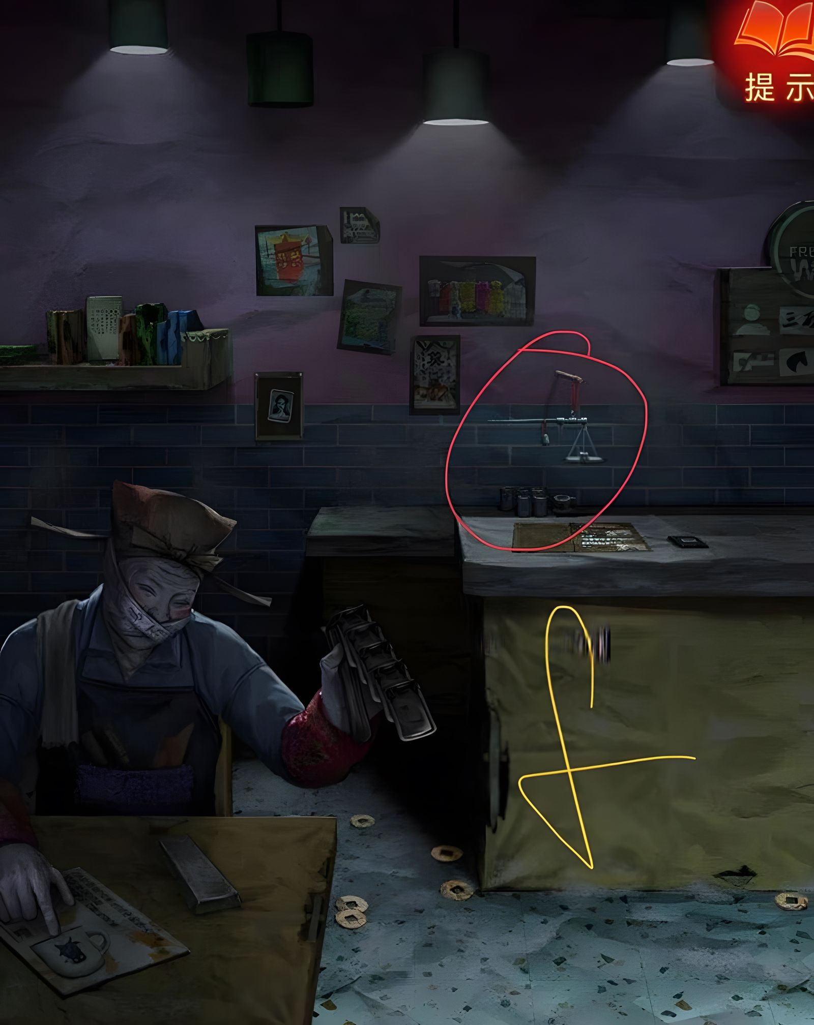 1、在福興咖啡屋場景的海報上可找到配方,需辛三錢、苦一錢半、酸一錢,關(guān)鍵是理解秤盤容器上的半錢甘這一基準單位,其對應(yīng)秤桿從右向左第二格的重量,即兩格重量為半錢甘。