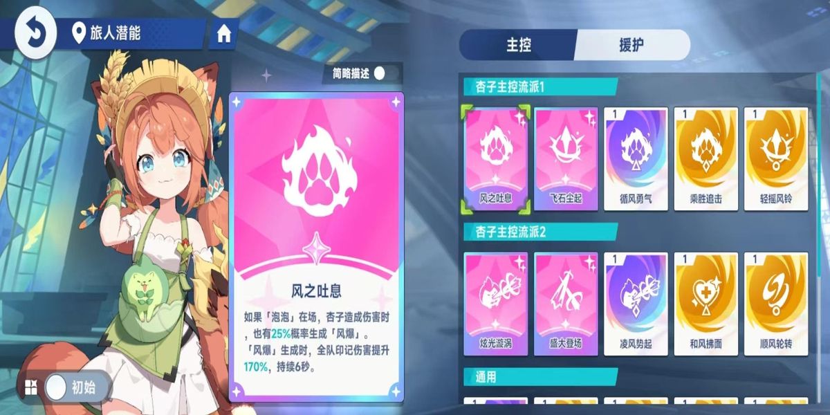 4、潛能選擇風(fēng)之吐息、飛石塵起、循風(fēng)勇氣、乘勝追擊、輕搖風(fēng)鈴等,如風(fēng)之吐息能讓泡泡在場時(shí)杏子傷害有幾率生成風(fēng)爆,風(fēng)爆炸時(shí)提升全隊(duì)印記傷害等,搭配增強(qiáng)其輔助效果。