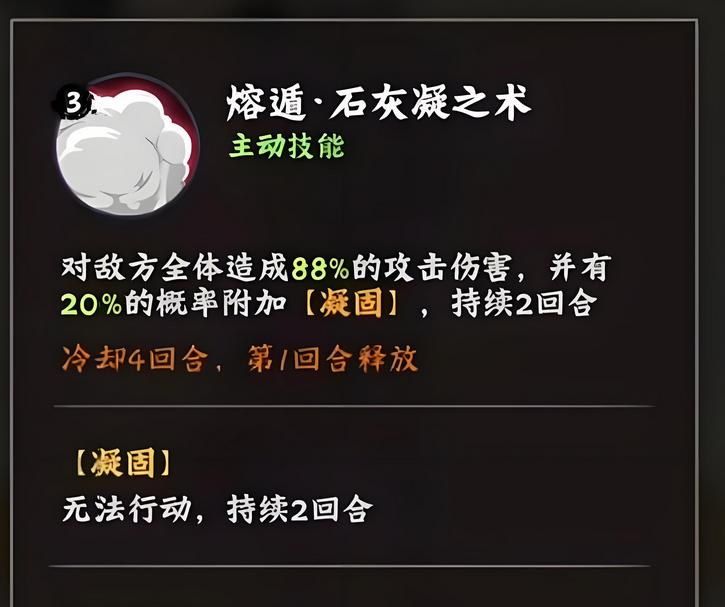 1、主動(dòng)技能熔遁石灰凝之術(shù),對(duì)敵方全體造成88%攻擊力傷害,20%附加凝固兩回合,凝固下敵方無法行動(dòng),傷害不高但范圍大,每次釋放能控制1到2名角色,控制效果大于傷害。