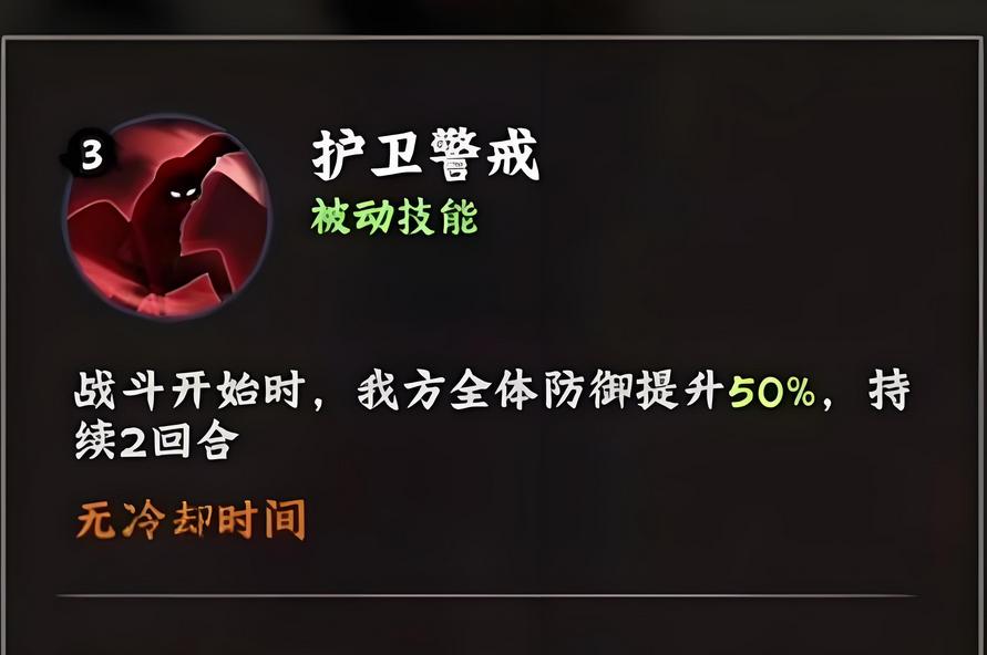 2、被動(dòng)技能護(hù)衛(wèi)警戒,戰(zhàn)斗開始時(shí)我方全體防御提升50%持續(xù)兩回合,開局生存加成強(qiáng),克制敵方開局爆發(fā)陣容,易獲取養(yǎng)成,適合平民融入陣容,是很多防御角色的平替。