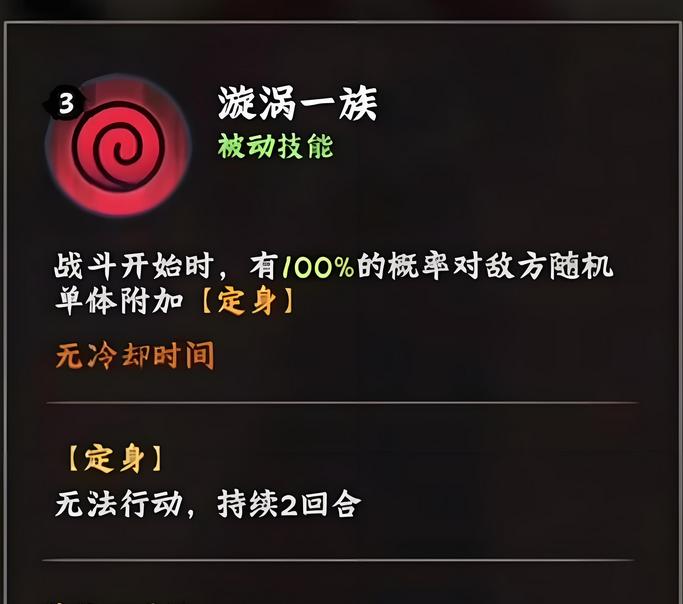 2、被動(dòng)技能漩渦一族是核心,戰(zhàn)斗開始時(shí)100%對(duì)敵方隨機(jī)單位附加定身,持續(xù)兩回合,高觸發(fā)率可通過多次戰(zhàn)斗嘗試控住敵方核心,大幅提升勝率。