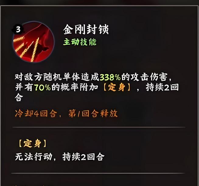 1、主動(dòng)技能金剛封鎖對(duì)敵方隨機(jī)單位造成338%攻擊力傷害,70%幾率附加定身持續(xù)兩回合,定身狀態(tài)下敵方無法行動(dòng),且不會(huì)因受攻擊解除,優(yōu)于束縛效果。