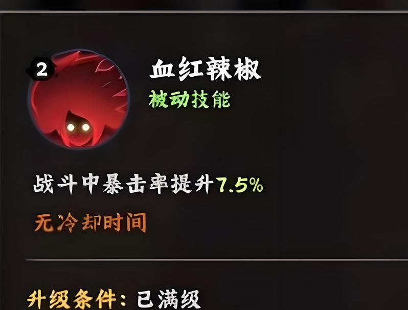3、被動(dòng)技能血紅辣椒使戰(zhàn)斗中暴擊率提升7點(diǎn)5%,作用不大,因該忍者傷害不高且缺被動(dòng)屬性加成,適合作為控制工具人,融入前期陣容,適應(yīng)平民玩家資源分配需求。