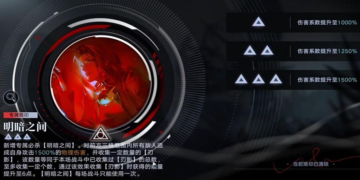 1、專屬烙印明暗之間是獨(dú)有的必殺技,揮出刀氣對前方三格敵人造成自身攻擊1000%/1250%/1500%物理傷害,收集總數(shù)的刃影最多6個,收集時獲額外能量,每場戰(zhàn)斗僅能用一次。