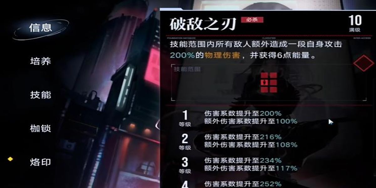4、必殺技破敵之刃消耗36點能量,揮刀對范圍內(nèi)敵人造成自身攻擊200%物理傷害附加1點核心傷害,消耗所有刃影,每消耗一個額外造成100%傷害并獲6點能量,升級后傷害提升。
