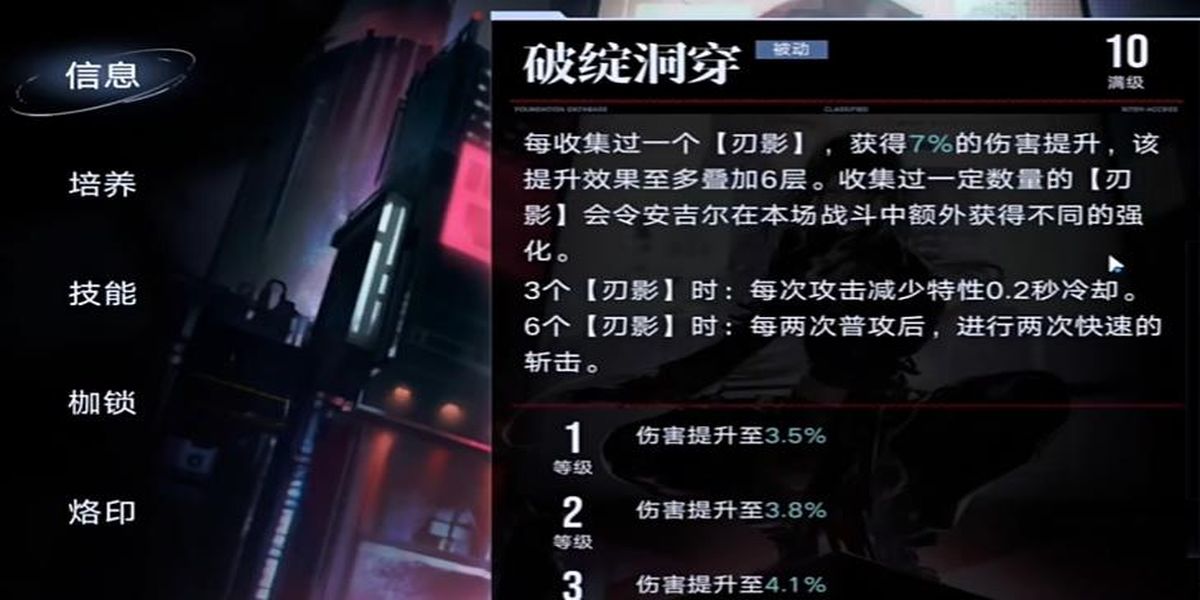 5、被動技能包括破綻洞穿和隱匿,前者每收集一個刃影獲3點5%傷害提升最多6層,收集3或6個有額外強(qiáng)化,后者受傷害時有20%到30%概率免疫,可增強(qiáng)生存能力。