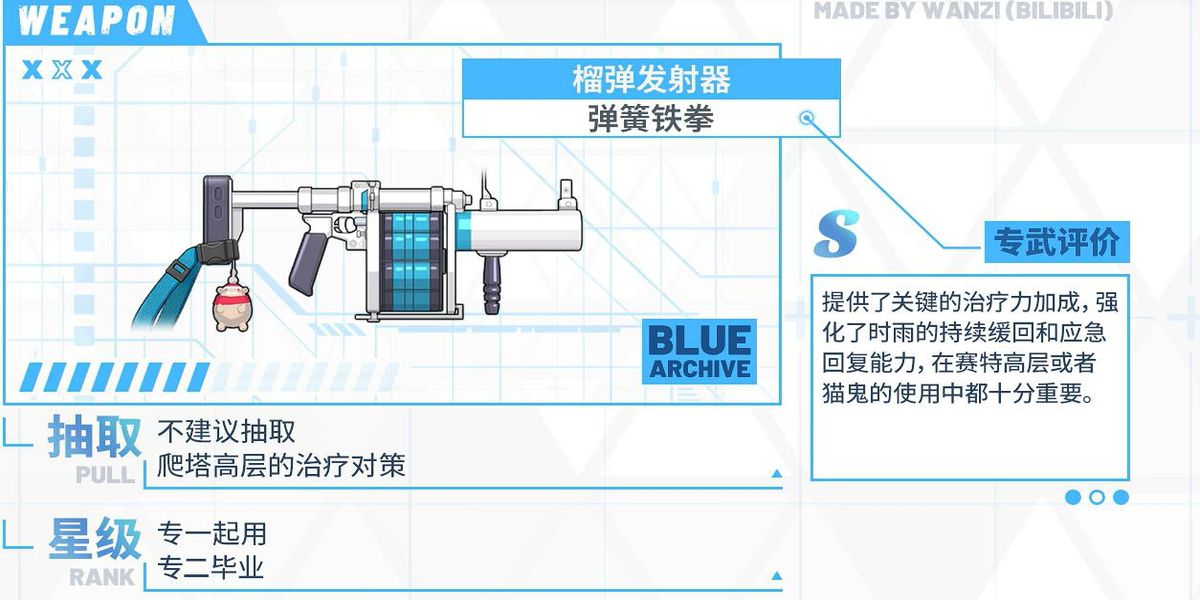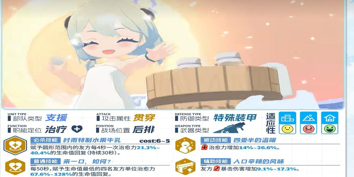 2、她定位為后排支援治療角色,攻擊類型為貫穿,防御為特殊裝甲,可跨隊使用,技能以治療為主,是當下少見的群奶,對生存能力較弱的隊伍有較大幫助。