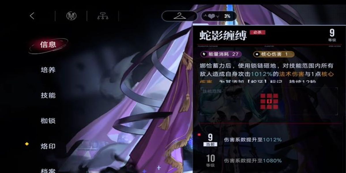 2、必殺蛇影纏縛需消耗27點(diǎn)能量,蓄力用鎖鏈砸地,對(duì)范圍內(nèi)敵人造成自身攻擊600%的法術(shù)傷害與1點(diǎn)核心傷害,還附加蛇牙標(biāo)記,是爆發(fā)性技能,可在關(guān)鍵時(shí)刻重創(chuàng)敵人。