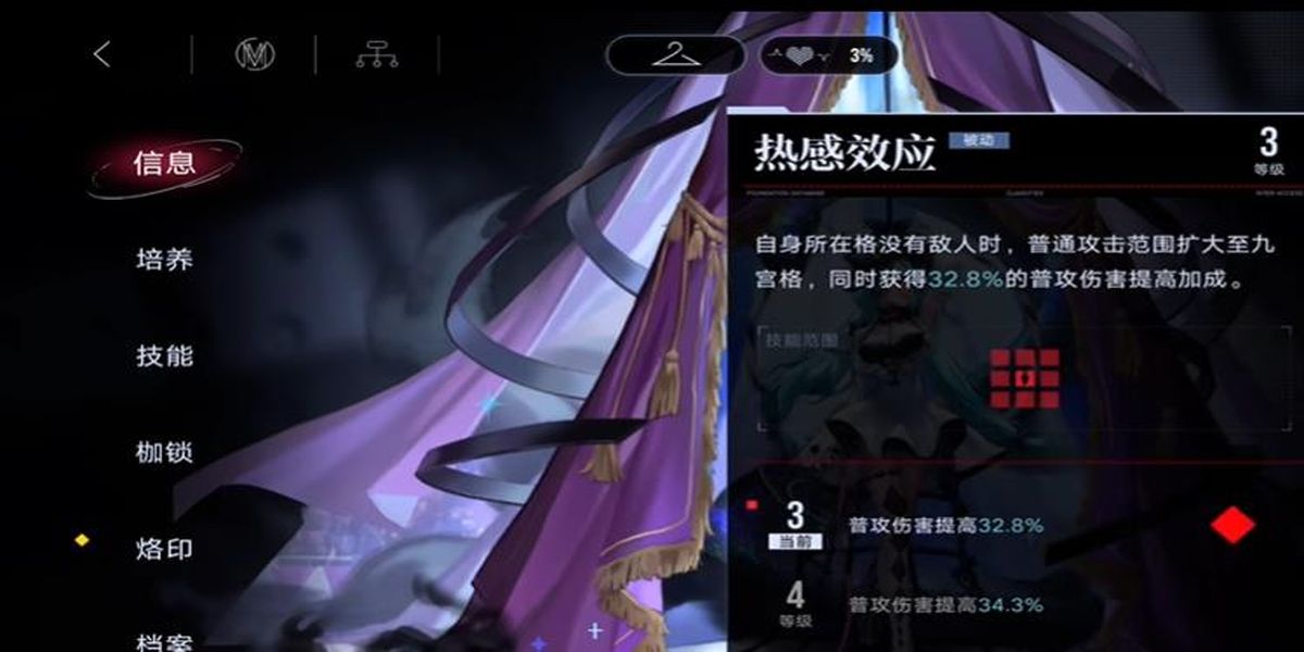 3、被動熱感效應(yīng)在自身地格無敵人時(shí)觸發(fā),普攻范圍擴(kuò)至周圍九宮地格,傷害提升30%,能增強(qiáng)普攻的覆蓋范圍與威力,讓娜恰在特定場景下輸出更高效。