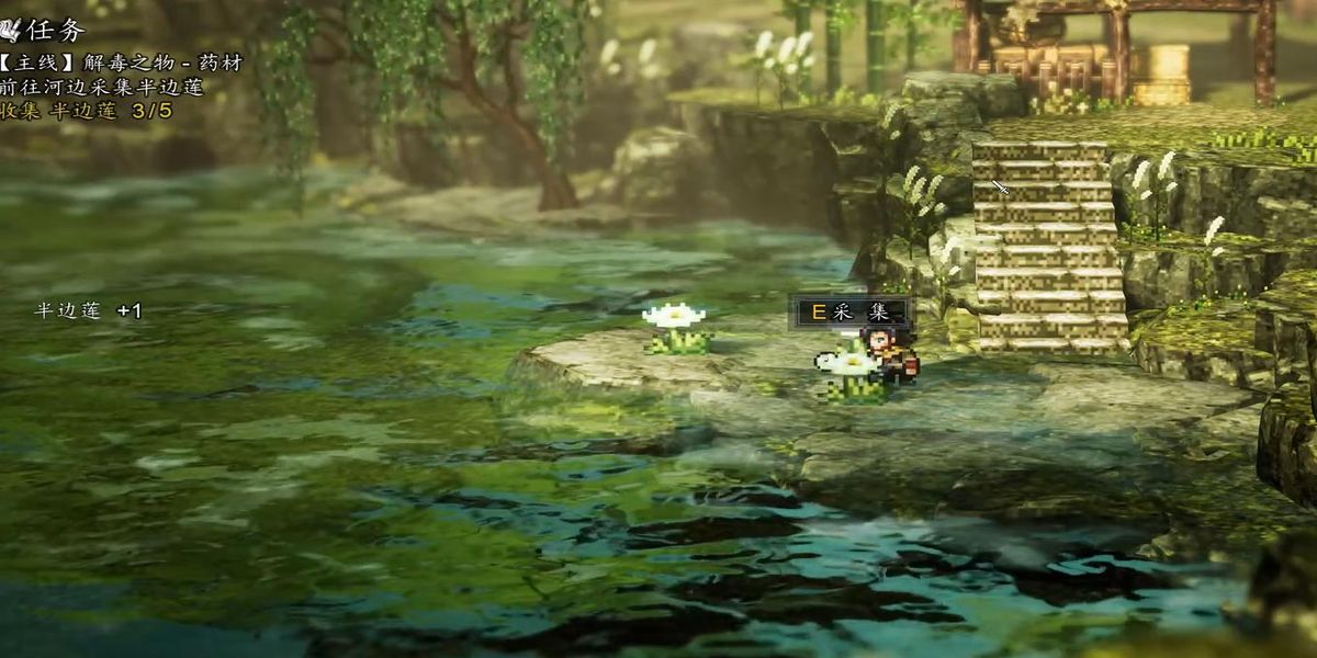 2、與江吟風(fēng)交談后找郎中取白芷和半邊蓮,郎中處有白芷,半邊蓮在郎中對(duì)面亭子下方采5朵,交給郎中得白芷和兩個(gè)金瘡藥,再交談獲天青花。