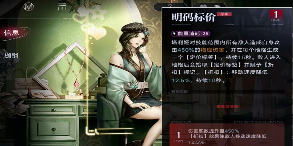 2、必殺明碼標(biāo)價(jià)能量消耗25,對(duì)技能范圍內(nèi)所有敵人造成自身攻擊450%的物理傷害,每個(gè)地格生成定價(jià)標(biāo)簽,敵人進(jìn)入后拾取并獲折扣標(biāo)記,移動(dòng)速度降低持續(xù)10秒。