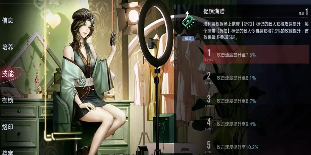 3、被動(dòng)1促銷(xiāo)滿(mǎn)贈(zèng)讓塔利婭根據(jù)場(chǎng)上攜帶折扣標(biāo)記的敵人獲得攻速提升,每個(gè)標(biāo)記敵人使其獲得攻速提升,該效果最多疊加5層,能有效提升其攻擊速度。
