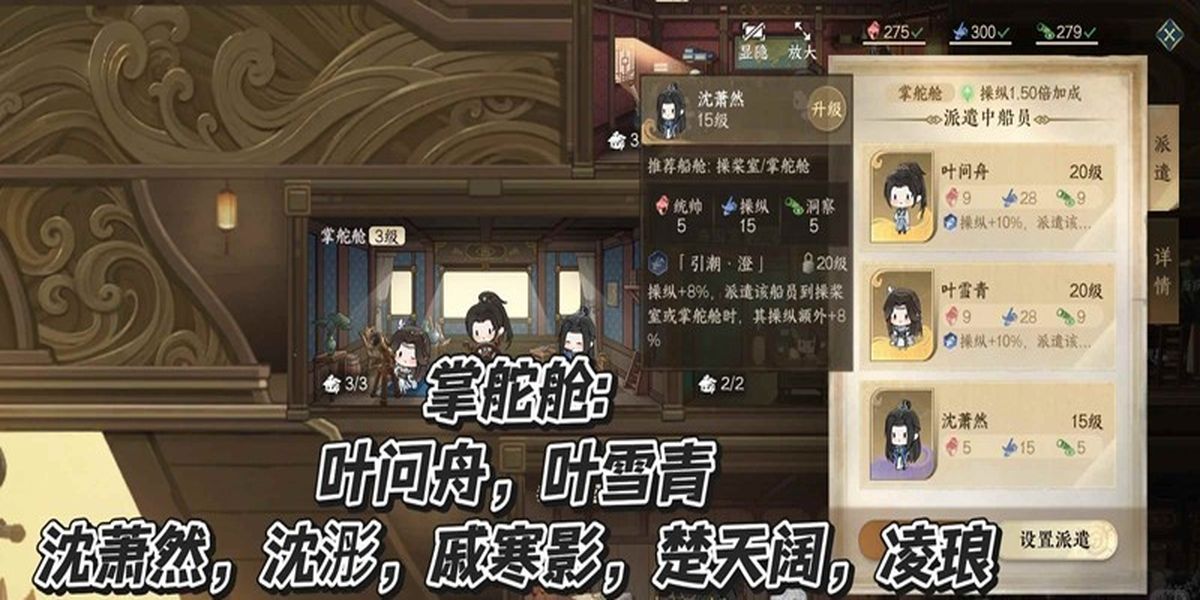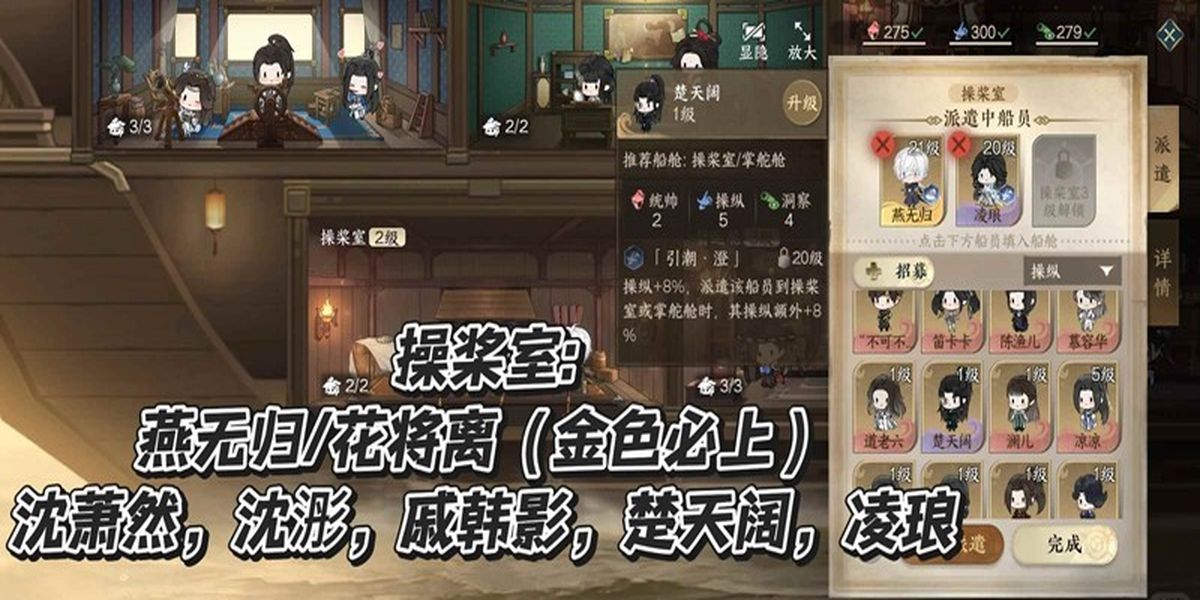 3、操槳室適合金級燕無歸、花將離,紫級沈蕭然、沈浵、戚寒影、楚天闊、凌瑯,紫色船員在掌舵艙或操槳室均可,有誰用誰,靈活安排船員位置。