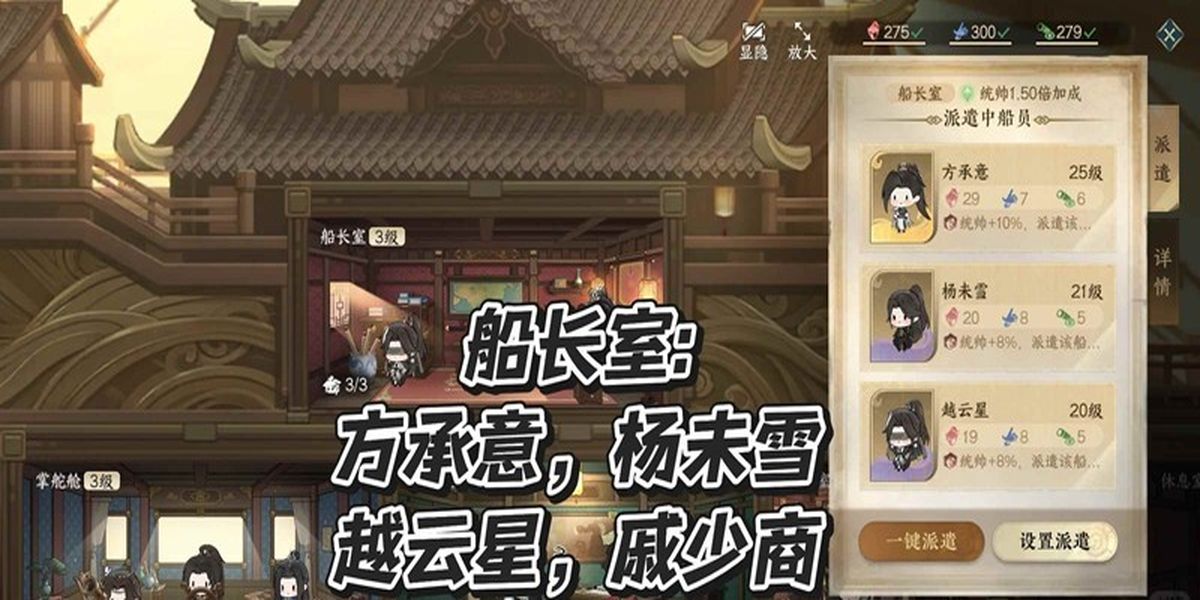 1、船長室適合金級方承意,紫級楊未雪、戚少商、越云星,掌舵艙適合金級葉問舟、葉雪青,紫級沈蕭然、沈浵、戚寒影、楚天闊、凌瑯,各船艙有適配船員類型。