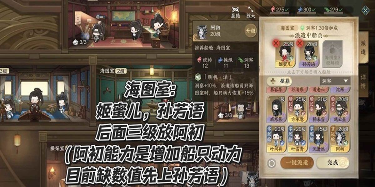 2、海圖室適合金級姬蜜兒,紫級孫芳語,后續(xù)開放阿初,阿初20級技能可加船只動(dòng)力15%,目前開兩格子先上孫芳語,后續(xù)換阿初,注重船員技能搭配。