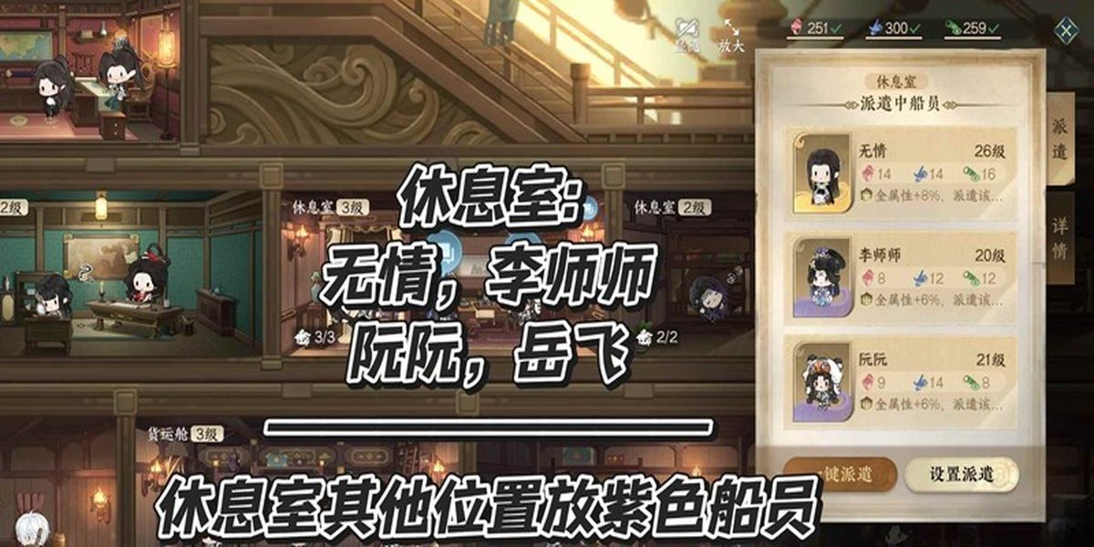 4、休息室有三個(gè)位置隨機(jī)放,適合金級無情,紫級李師師、岳飛、阮阮,剩下格子放沒崗位的紫色船員或升級過的紅色船員,貨運(yùn)艙目前推薦阿初,其他放能力高的船員。