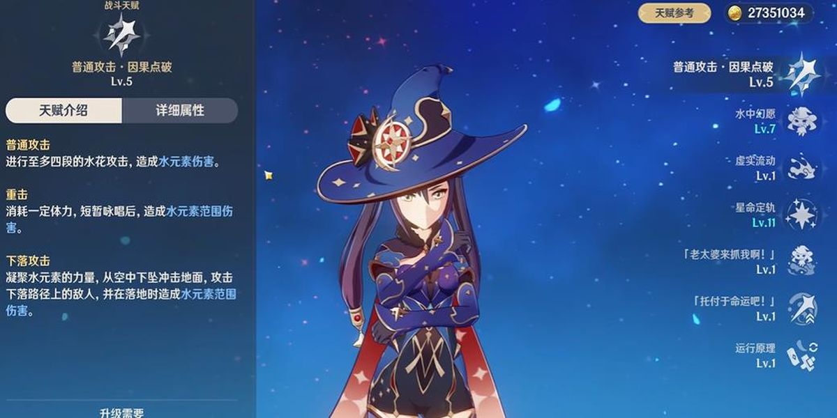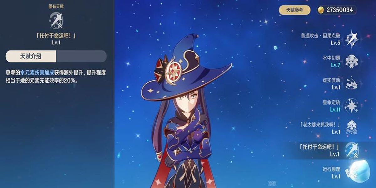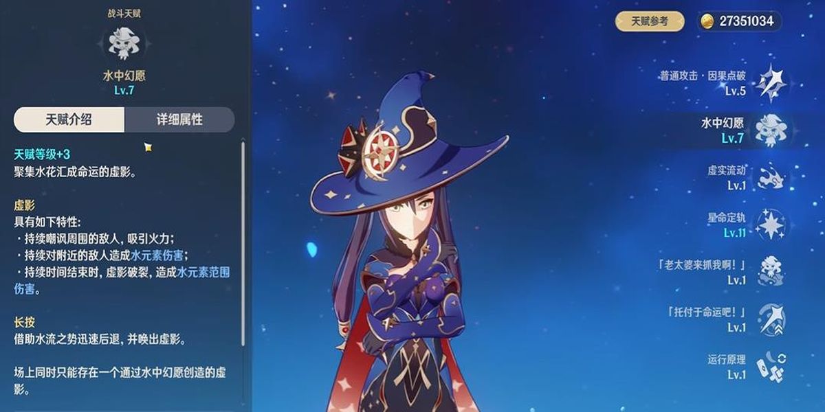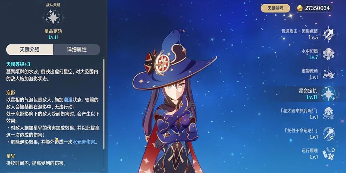 3、元素爆發(fā)為星命定軌,創(chuàng)造映照夜空的幻境,對范圍內(nèi)敵人造成大量水元素傷害,幻境持續(xù)期間降低敵人水元素抗性和物理抗性,同時(shí)使范圍內(nèi)的敵人受到的傷害增加。