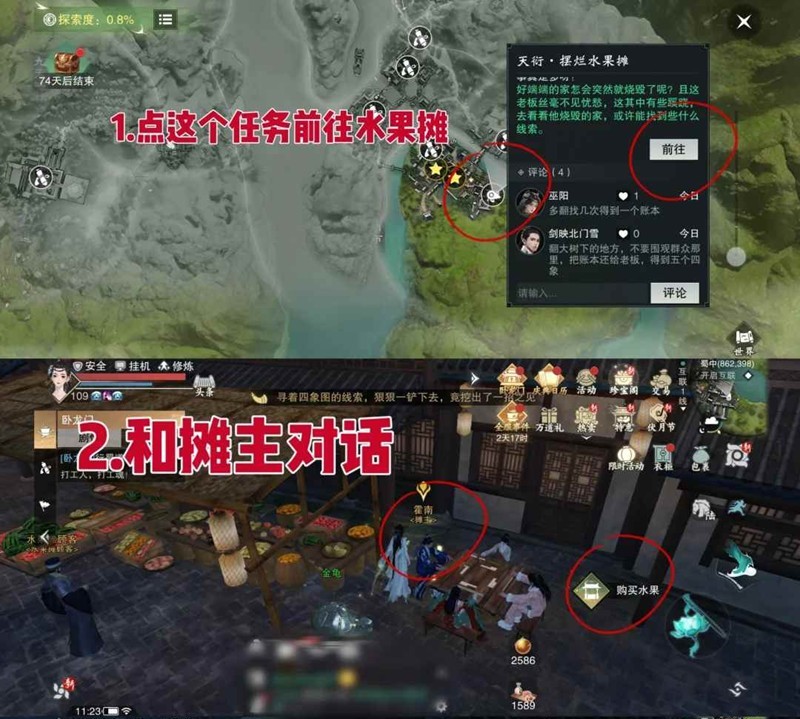 2、將找到的賬本交給攤主,解鎖水果攤購買權(quán)限,此時可購買三個香蕉,香蕉是后續(xù)任務(wù)的重要物品,需確保數(shù)量足夠。