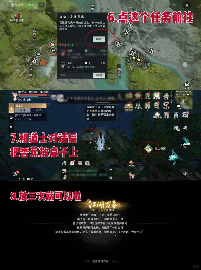 3、點擊地圖上的危崖悲客任務(wù)前往指定地點,與道士對話準(zhǔn)備進行下一步操作,將香蕉放在道士背后的石桌上,然后走遠等待猴子過來,重復(fù)放置三次香蕉,完成獲得寶絡(luò)掛件。