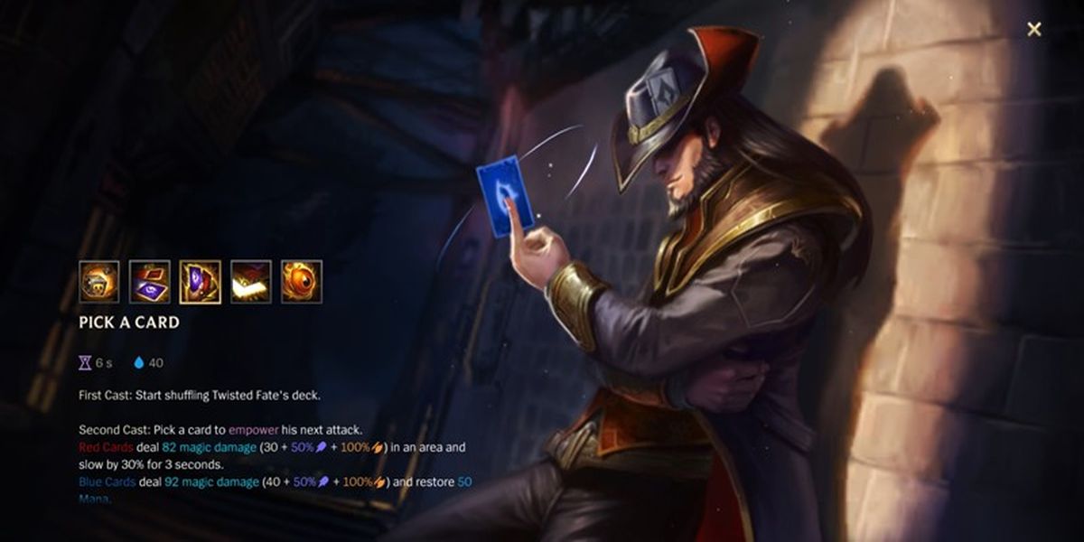 3、W技能選牌是核心技能,使用后進(jìn)入切牌狀態(tài),按紅牌黃牌藍(lán)牌順序循環(huán)切換,紅牌造成范圍傷害和減速,黃牌單體眩暈,藍(lán)牌回復(fù)法力值且單體傷害最高。