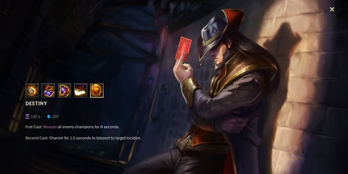 5、R技能命運(yùn)開啟全圖視野,短暫延遲后可傳送到地圖任意位置,賦予其極強(qiáng)支援和分推能力,是帶動游戲節(jié)奏的關(guān)鍵技能,合理使用能掌控戰(zhàn)局走向。