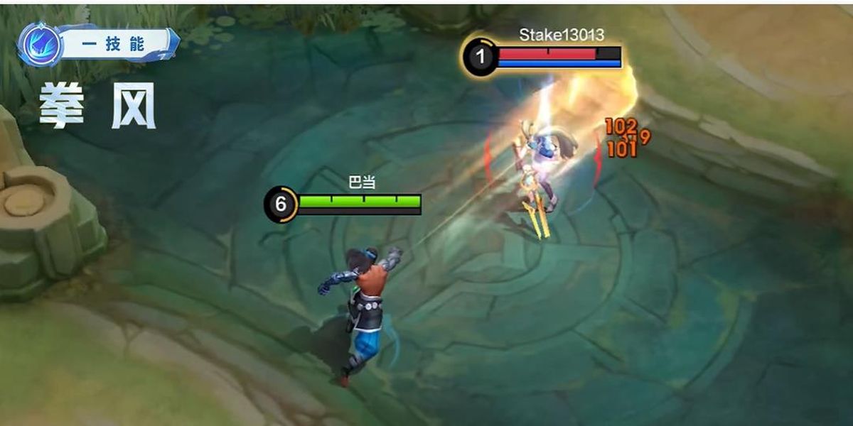2、一技能拳風(fēng),巴當(dāng)聚力揮出拳風(fēng)傷敵并附減速,觸阻擋物會(huì)引發(fā)爆炸增傷,對(duì)線期可遠(yuǎn)程清兵、消耗敵方英雄血量,助力建立優(yōu)勢(shì)。