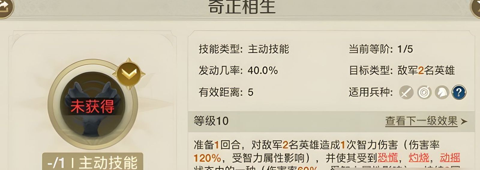 1、主動(dòng)技能奇正相生,對敵方兩名目標(biāo)發(fā)動(dòng)智力攻擊,有概率附加灼燒或動(dòng)搖狀態(tài)持續(xù)3回合,若目標(biāo)已處兩種狀態(tài)之一,60%概率造成雙倍傷害并附加另一種狀態(tài)。