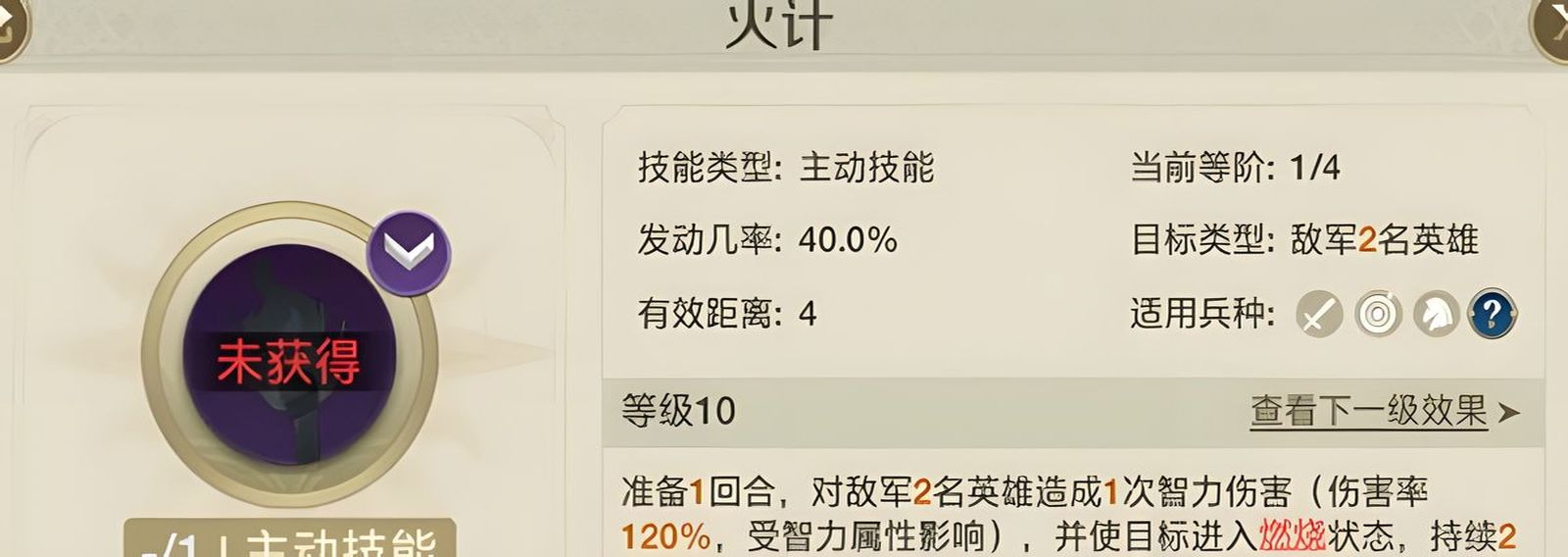 3、招牌技能火計(jì),對敵軍兩名英雄造成一次智力傷害,附加灼燒狀態(tài)持續(xù)2回合,若目標(biāo)已處灼燒狀態(tài)則效果翻倍,40%的觸發(fā)概率在實(shí)戰(zhàn)中相當(dāng)可靠,助力持續(xù)輸出。