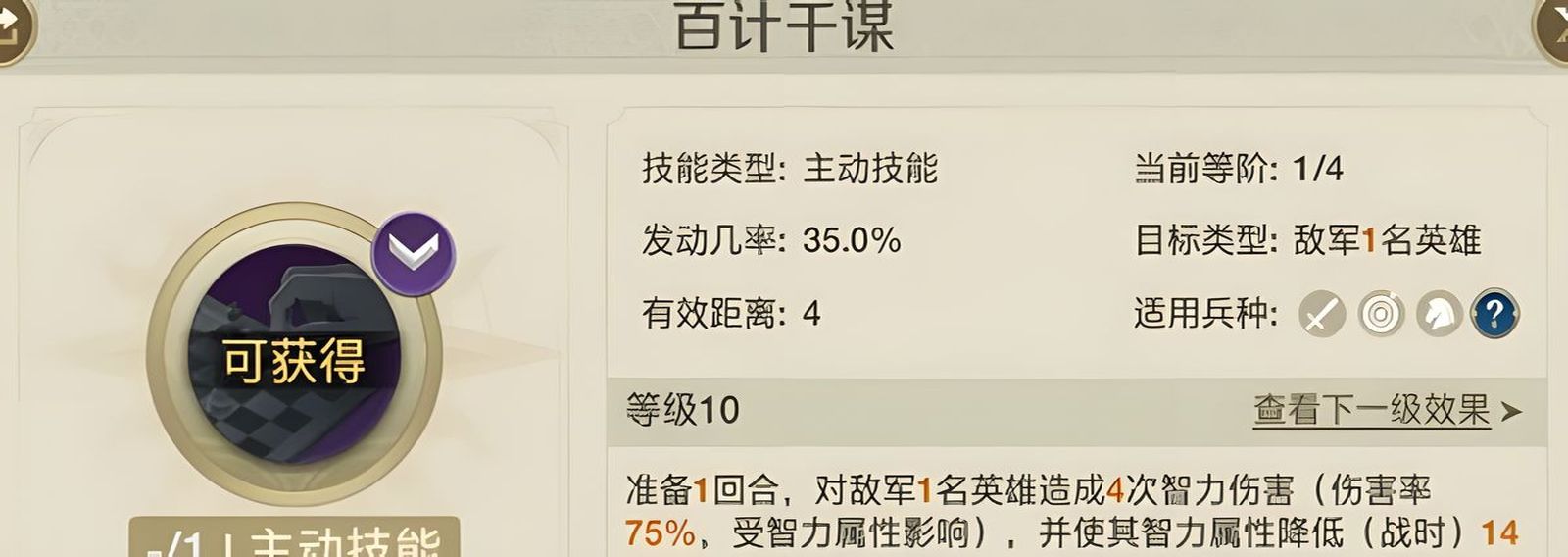 2、百計(jì)千謀需準(zhǔn)備1回合,對敵軍1名英雄發(fā)動(dòng)4次智力傷害且傷害率可觀,明智光秀使用時(shí)能借該技能打出連續(xù)輸出,同時(shí)可配合自身其他技能增強(qiáng)戰(zhàn)力,為戰(zhàn)局帶來有利影響。