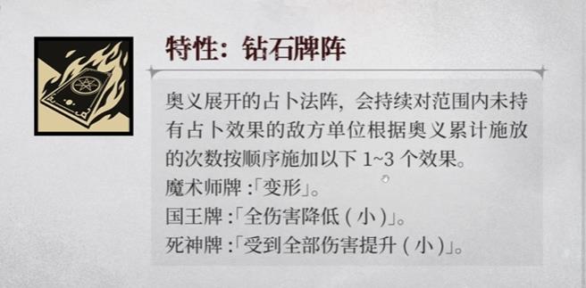 4、特性鉆石牌陣讓法陣對未持占卜效果的敵方,按奧義累計施放次數(shù)施加變形全傷害降低小受到全部傷害提升小等效果,遺產(chǎn)選海神之顱可增強傷害。