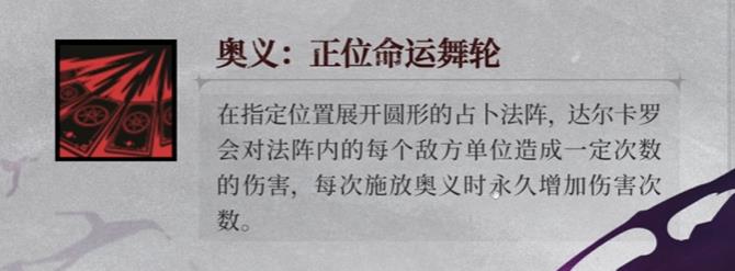 3、奧義正位命運舞輪展開持續(xù)10秒的圓形法陣,對范圍內(nèi)敵方釋放3張牌,每張造成375%法術(shù)傷害,后續(xù)施放增加1張,至多5張,輸出隨次數(shù)逐步提升。