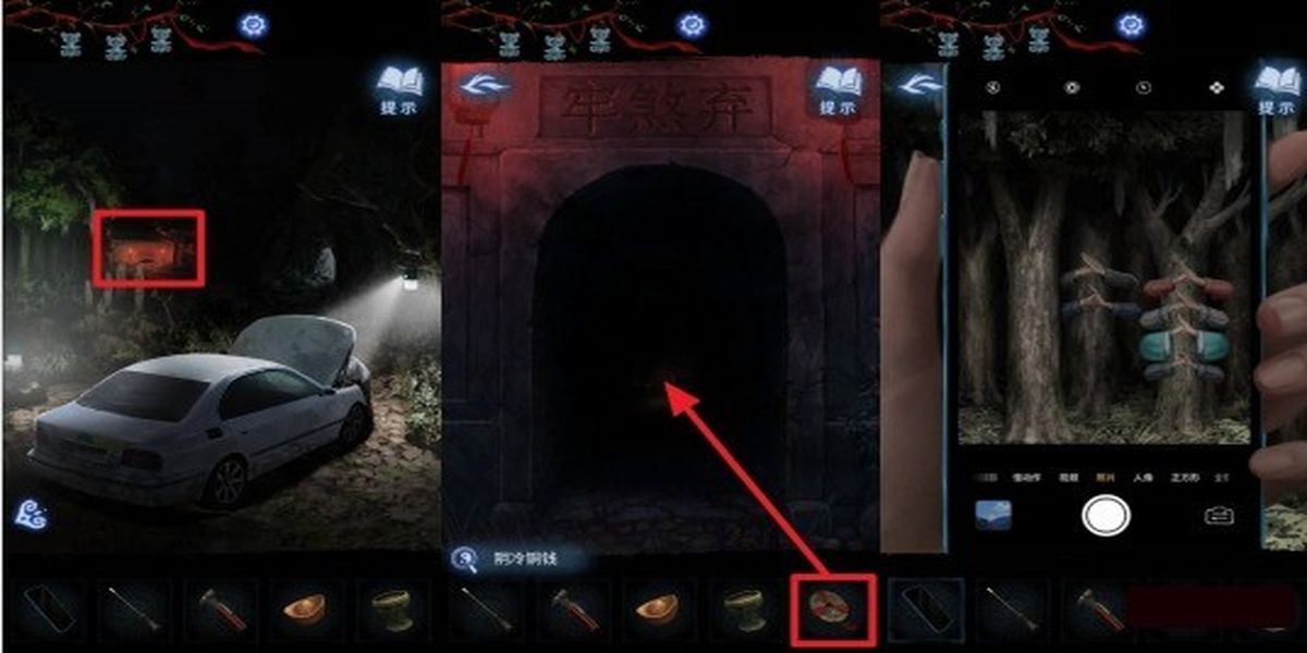 3、回到寧子服和車所在區(qū)域,點擊遠處棄煞牢,用道具欄的陰冷銅錢吸走煞氣,先不進入,再用手機拍綠色樹林獲取新線索,為后續(xù)解謎做準備。