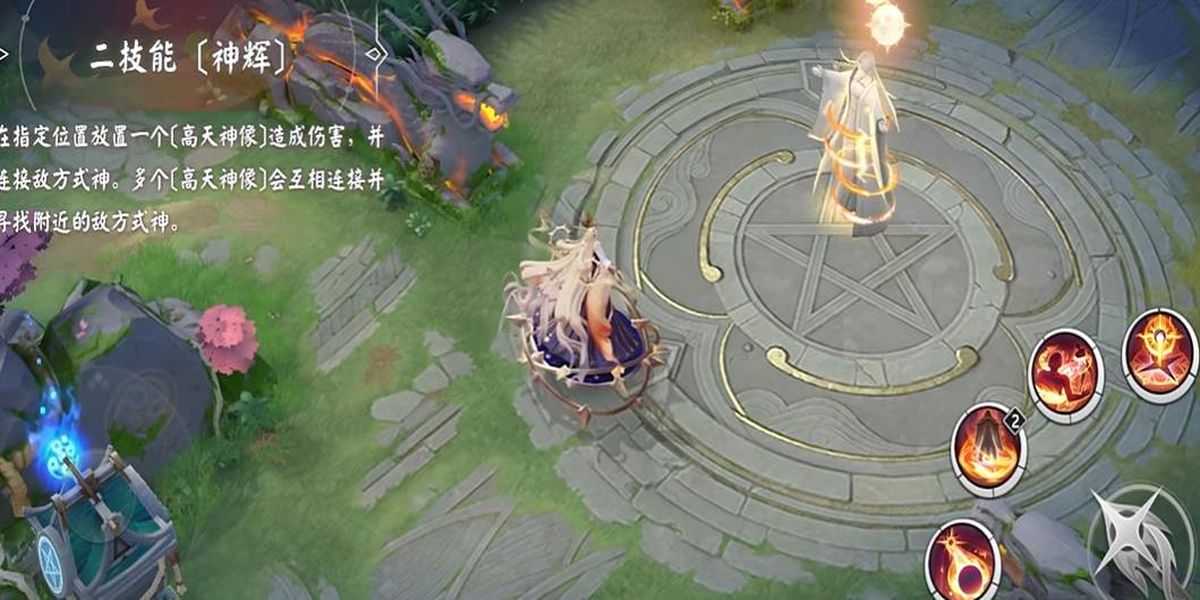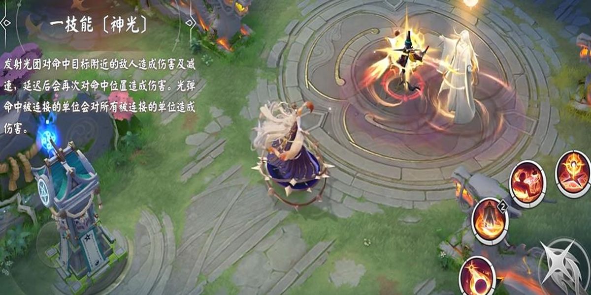 2、一技能神光向指定方向釋放光輝之力,命中敵人及周圍目標(biāo)造成傷害與減速,延遲后匯聚光輝之劍再造成傷害,命中被連接目標(biāo)或神像時(shí)對所有被連接者造成同樣傷害。
