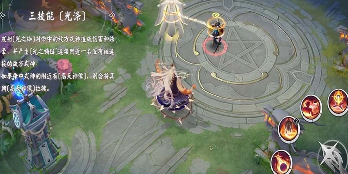 4、三技能光滌向指定方向施放光之枷,命中式神造成傷害及眩暈,附近有未被連接式神時(shí)產(chǎn)生鎖鏈連接二者,命中眩暈式神且附近有神像時(shí)將其拉拽向神像。