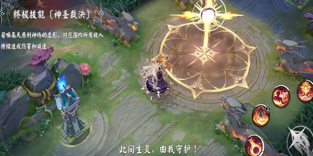 5、終極技能神圣裁決在指定區(qū)域召喚刑神場,對范圍內(nèi)敵人造成傷害及減速,刑神場存在期間每零點(diǎn)五秒造成傷害及減速,11級(jí)后中心處刑十字有額外效果。