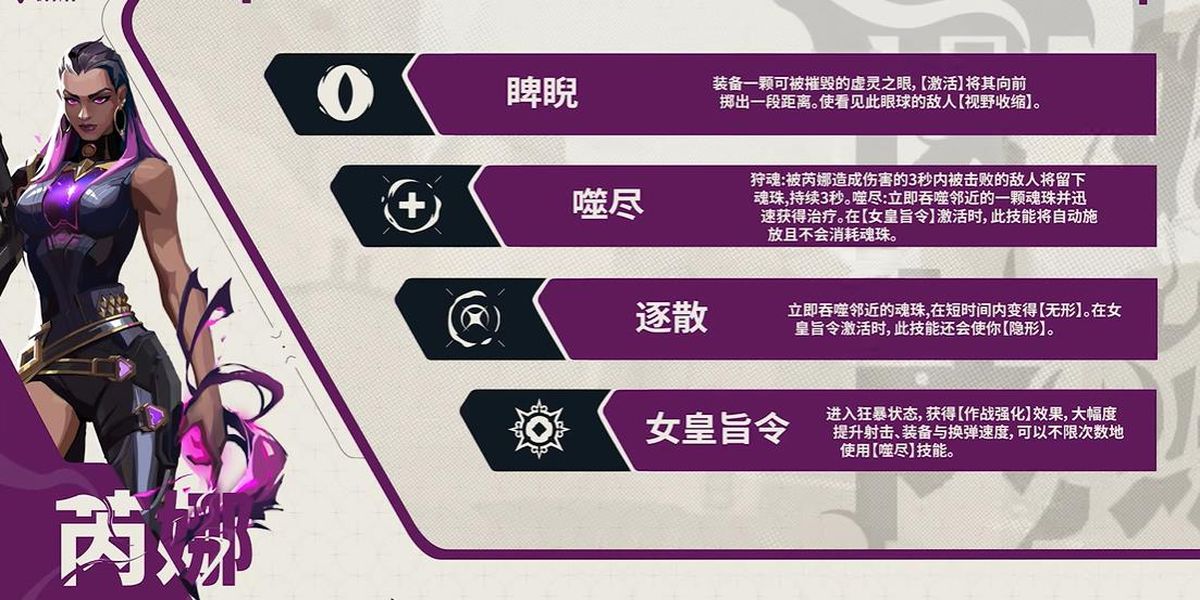 1、睥睨芮娜可裝備一顆可被摧毀的虛靈之眼,激活后將其向前擲出一段距離,使看見此眼球的敵人視野收縮,能干擾敵人判斷,為自己創(chuàng)造有利局面。