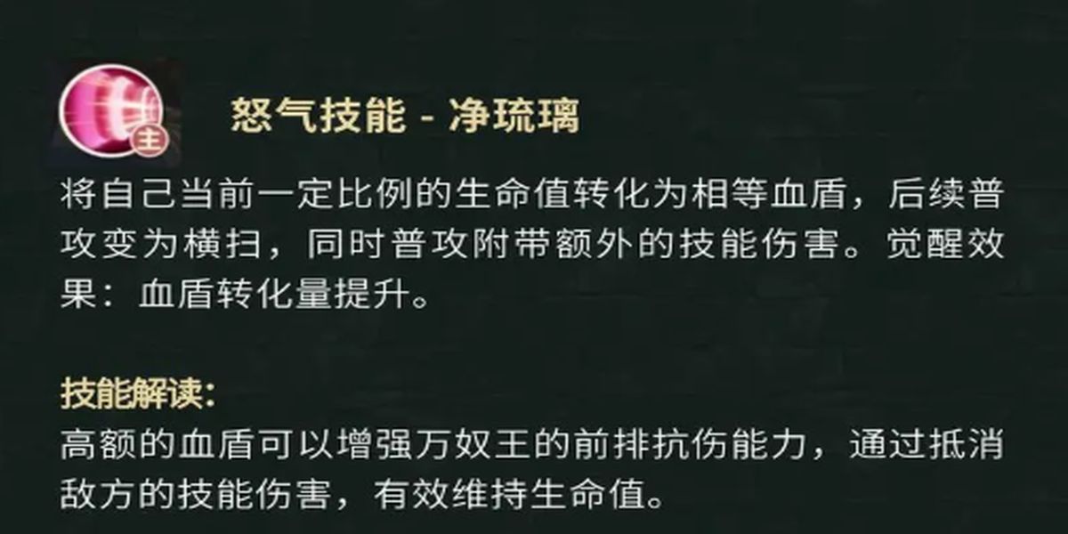 2、凈琉璃將自身當(dāng)前一定比例生命值轉(zhuǎn)化為相等血盾,后續(xù)普攻變?yōu)闄M掃且附帶額外技能傷害,覺醒后血盾轉(zhuǎn)化量提升,高額血盾可增強前排抗傷能力。