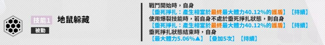 1、地鼠躲藏技能讓莫莉戰(zhàn)斗開始獲得垂死掙扎狀態(tài),產(chǎn)生40%護盾效果,狀態(tài)結(jié)束給予最大體力5%加成最多疊5層,用爆裂技能時不處于該狀態(tài)會再次獲得護盾。