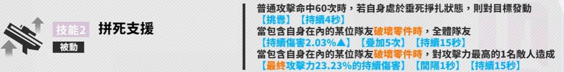 2、拼死支持技能中,莫莉普攻命中60次且處于垂死掙扎狀態(tài),觸發(fā)4秒挑釁效果,隊友破壞零件全體獲2%持續(xù)傷害加成最多疊5層持續(xù)15秒,對攻擊力最高敵人造成23%持續(xù)傷害。