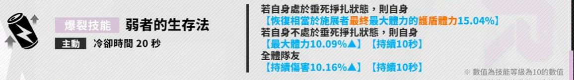 3、弱者的生存法是爆裂技能,依當(dāng)前狀態(tài)提供不同效果,處于垂死掙扎狀態(tài)恢復(fù)15%最大體力護盾,否則獲10%體力加成持續(xù)10秒,同時全體隊友獲10%持續(xù)傷害加成持續(xù)10秒。