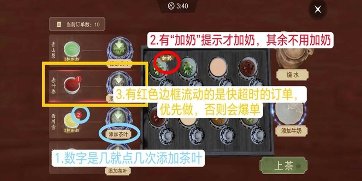 3、節(jié)約時間小技巧不用清垃圾,不用做噴火變臉任務(wù),太浪費時間,不做不影響是否爆單,泡完茶可先點燒水再去送茶,能節(jié)約燒水時間,送茶回來后水也燒好了。