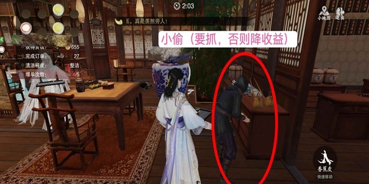 2、因剛開局客人不多,看著上方倒計時,夠30秒以上再回去做茶,只抓一次小偷,拿一鍵送茶技能,來不及送茶時可用,第一次抓小偷必得,后面抓小偷概率得。