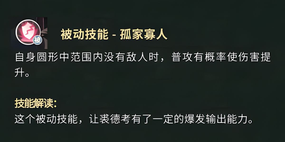 3、被動技能孤家寡人當裘德考自身圓形中范圍內(nèi)沒有敵人時,普攻有概率使傷害提升,這個被動技能賦予了他一定的爆發(fā)輸出能力,在合適的時機能打出更高傷害。