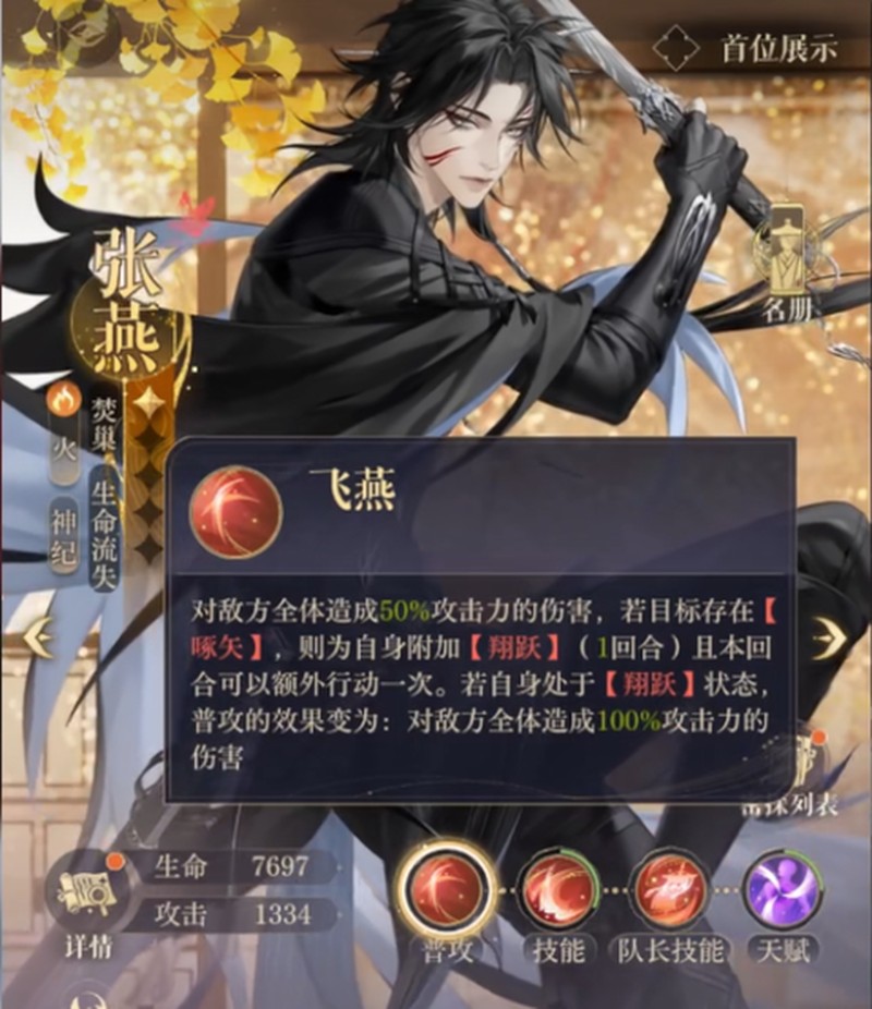 2、普攻飛燕在命中帶有啄矢狀態(tài)的敵人時(shí),能觸發(fā)翔躍效果獲得額外行動(dòng)機(jī)會,此機(jī)制讓他單回合內(nèi)可多次攻擊,配合其他技能能打出驚人的連擊傷害。