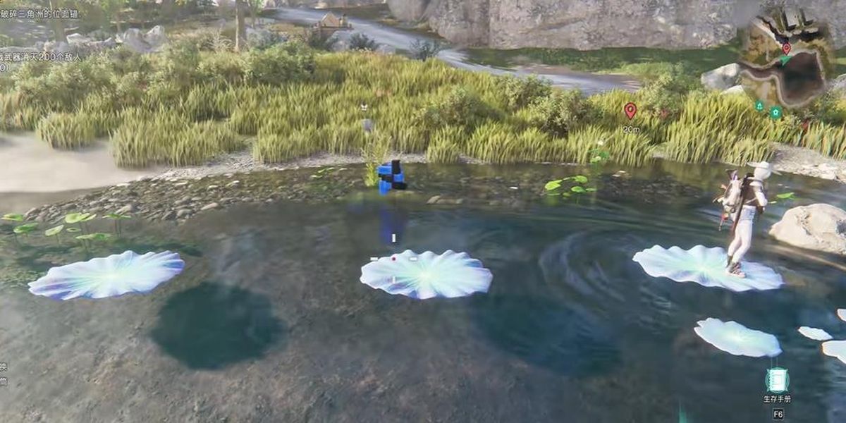 2、找到三片特殊荷葉后依次跳上去進(jìn)行交互,每片荷葉交互后會有相應(yīng)反饋,完成荷葉交互事件后回到出發(fā)點,尋找并打開此處的寶箱,即可獲得后護(hù)手握把。