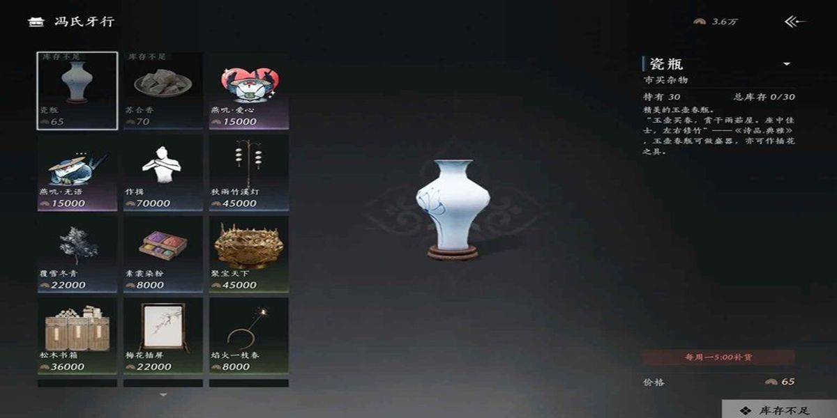 4、前往馮氏牙行或其他商店購(gòu)買這三種商品,由于商品背包有限,要先在馮氏牙行老板那里租最大的房子增加背包容量,同時(shí)在百業(yè)技藝?yán)锷?jí)市買背包容量,以便購(gòu)買更多商品。