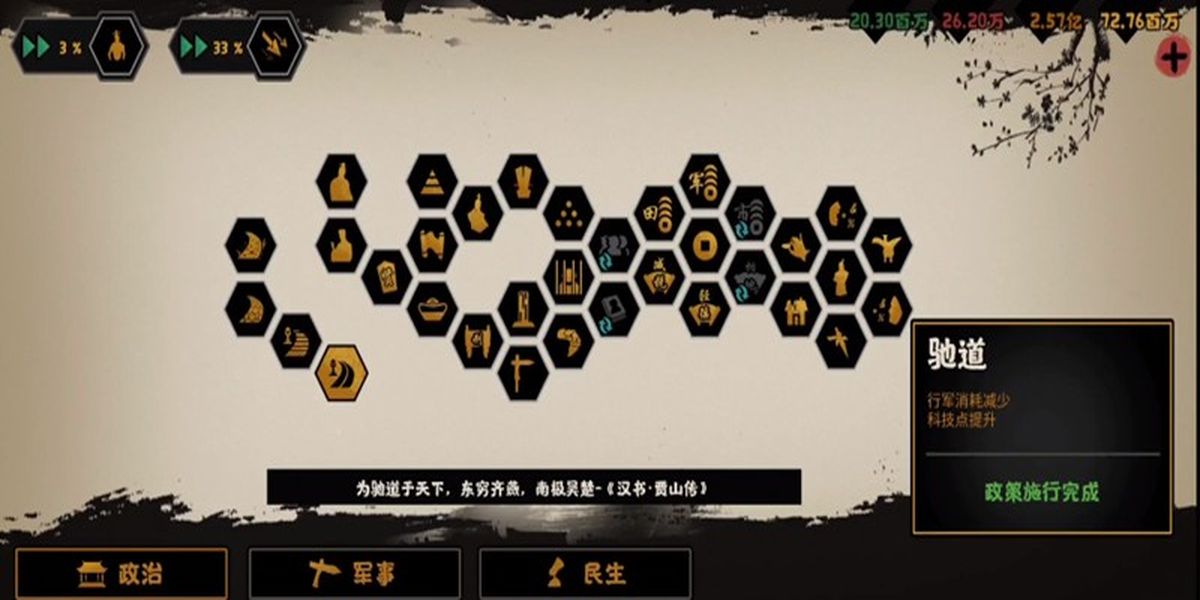 1、升級政治軍事民生等各類政策可直接獲得科技點獎勵,部分政策升級標注科技提升效果,也有些可能導致科技點減少,升級前需仔細查看說明,謹慎選擇。