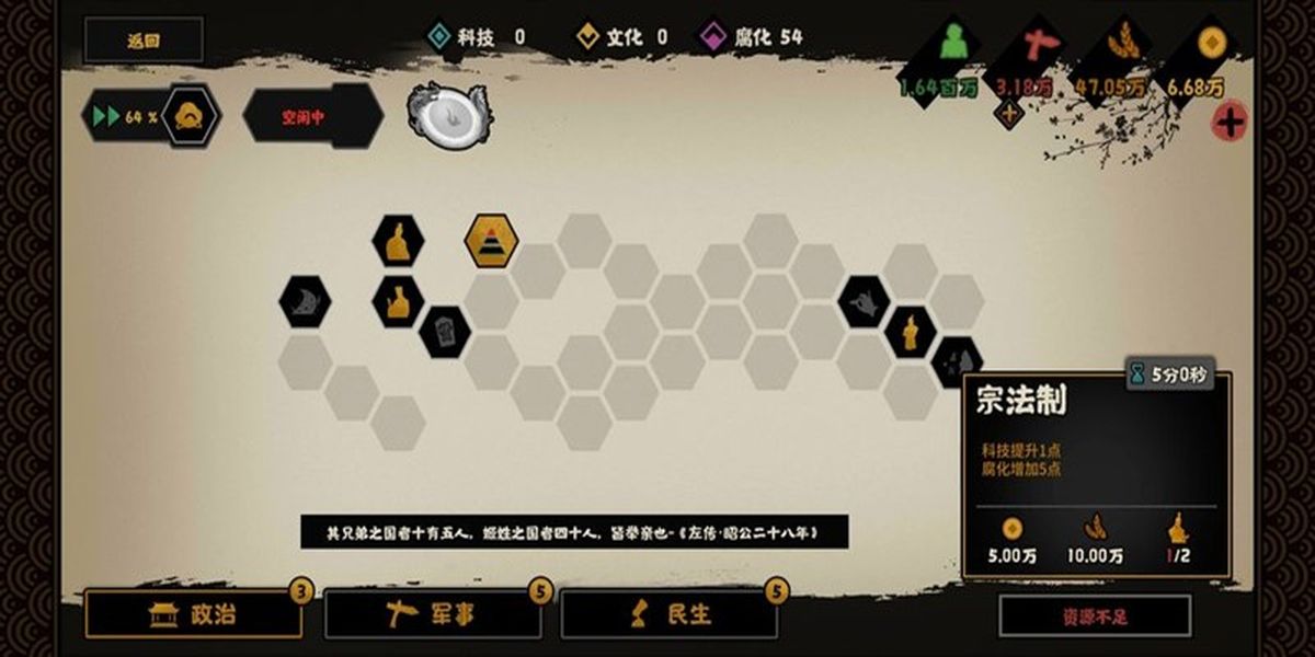 4、隨著游戲進(jìn)程推進(jìn),后期士子資源會逐漸充裕,需要注意的是士子無法通過國家間貿(mào)易獲得,必須依靠本國生產(chǎn),規(guī)劃好本國生產(chǎn)布局有助于穩(wěn)定獲取士子。