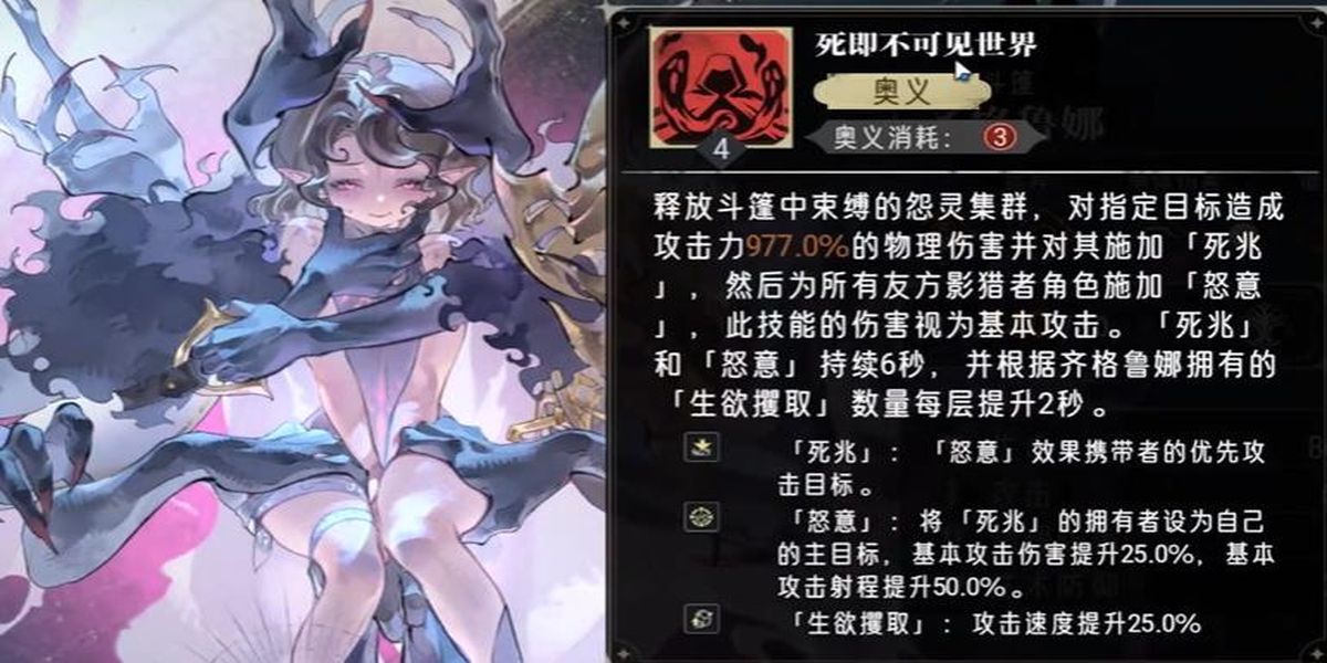 4、奧義死即不可見世界會(huì)釋放怨靈集群攻擊目標(biāo)并施加死兆效果,同時(shí)為隊(duì)友提供怒意增益大幅提升全隊(duì)輸出,這個(gè)技能讓齊格魯娜在關(guān)鍵時(shí)刻能夠改變戰(zhàn)局。